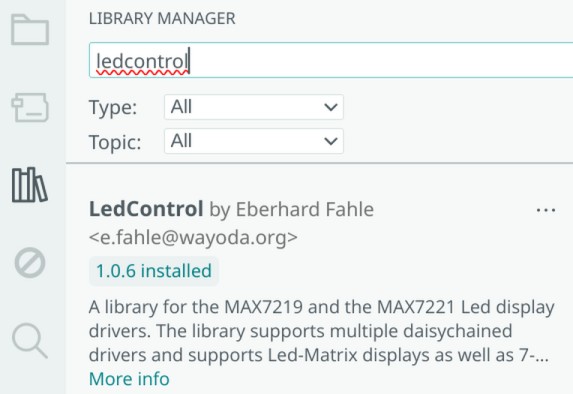 Klicke auf das Bibliothek-Symbol, suche nach "LedControl" und installiere die Bibliothek: