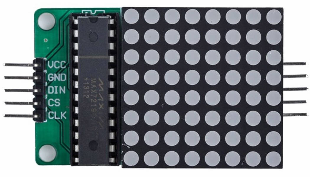 Auf diesem Modul befindet sich das IC MAX7219 von Maxim sowie eine 8×8-LED-Matrix mit insgesamt 64 Leuchtdioden.