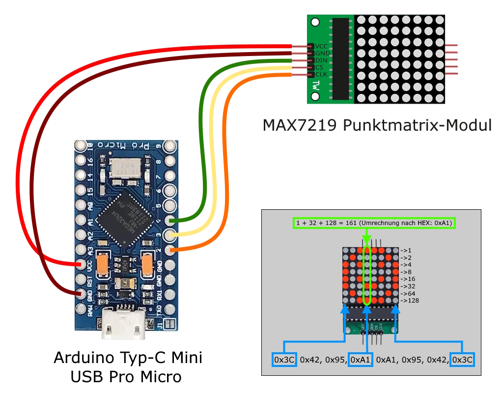 Das Bild zeigt, wie das MAX7219-Punktmatrix-Modul mit dem Arduino USB Pro Micro verbunden wird. Nutze 5 Steckbrückenkabel und stelle die Verbindungen her.